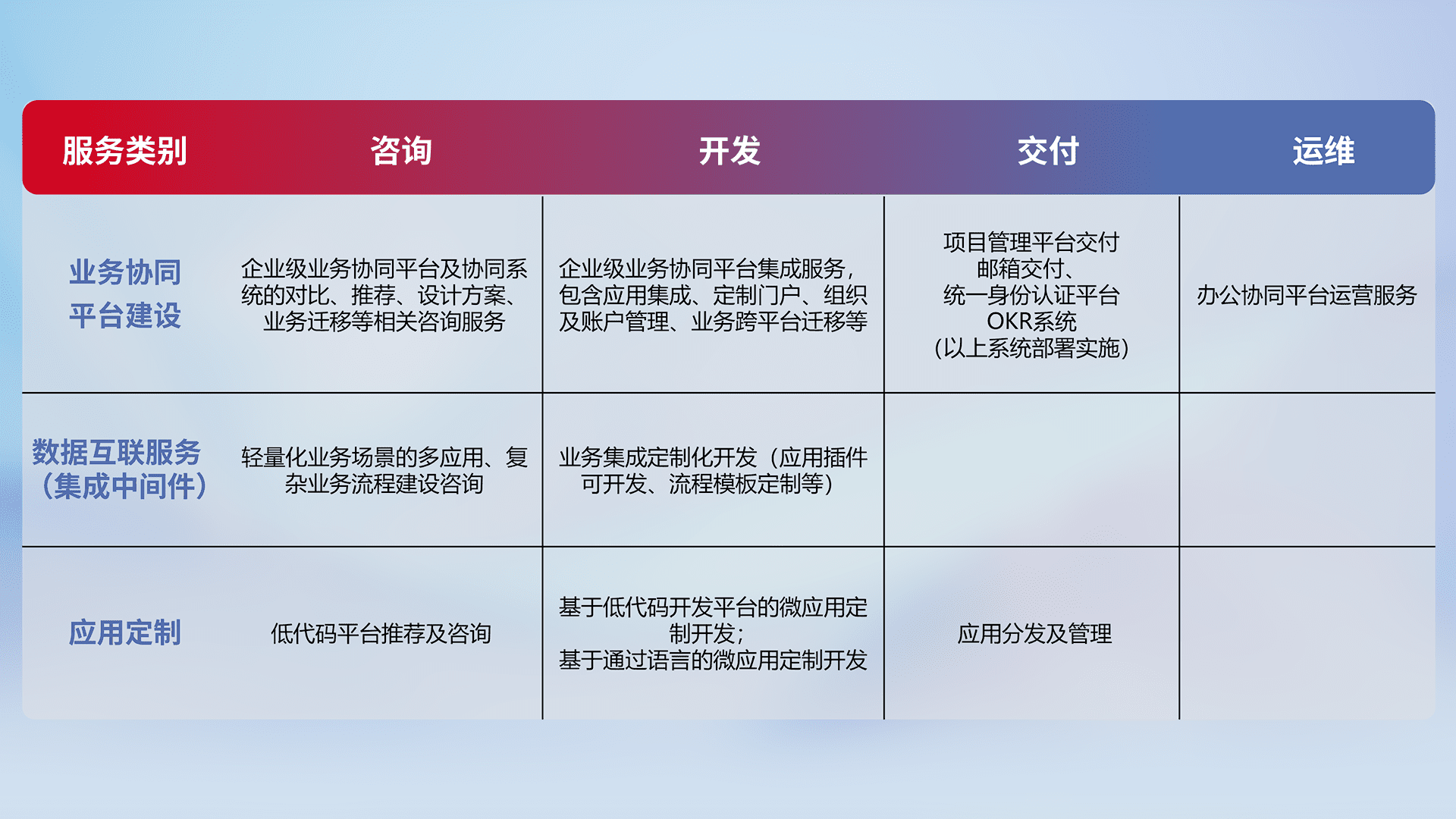 针对钉钉、、、企微、、、、IDaas等平台级产品提供产品的规划、、方案、、、、交付、、、定制化开发等服务,,,,实现如统一协同办公、、智能客户服务、、、、混合会议管理、、智能数据查询、、、、等业务场景,,实现数字化转型。。